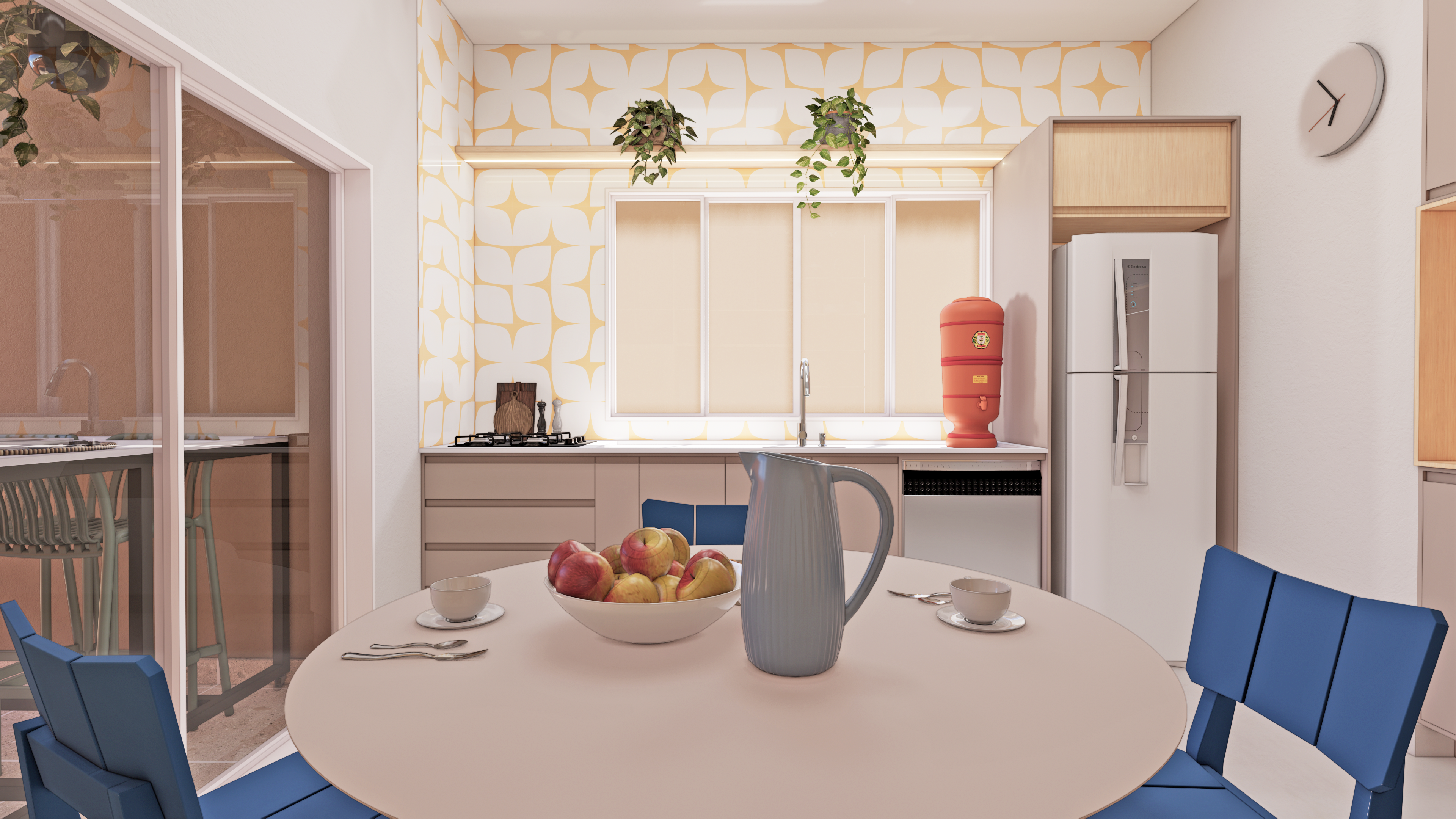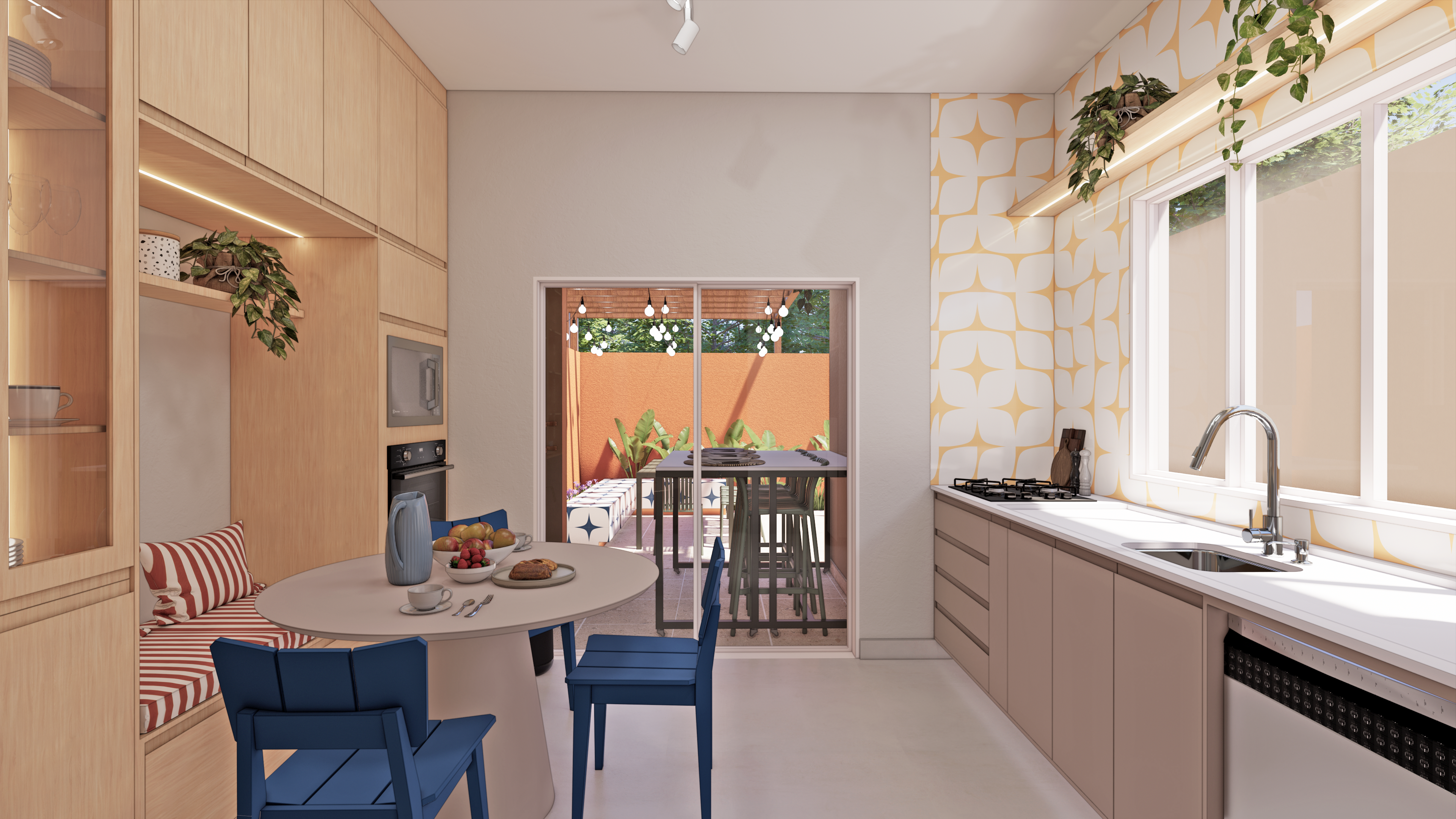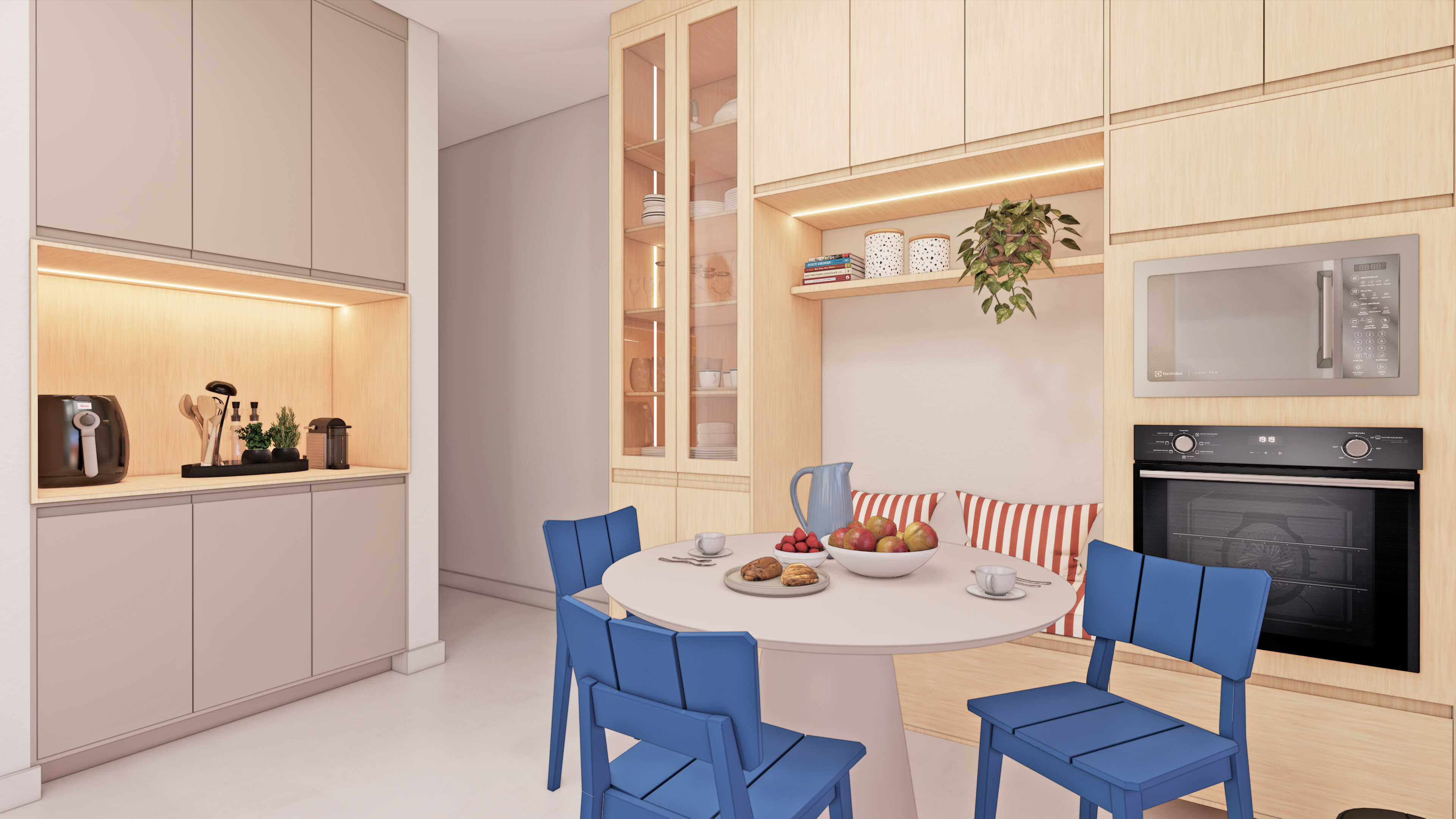 O restante da cozinha oferece amplos espaços de armazenamento, sempre aliados à estética. A cristaleira e os detalhes coloridos, junto aos desenhos da marcenaria, tornam o ambiente descontraído e único, reforçando a personalidade vibrante do espaço.