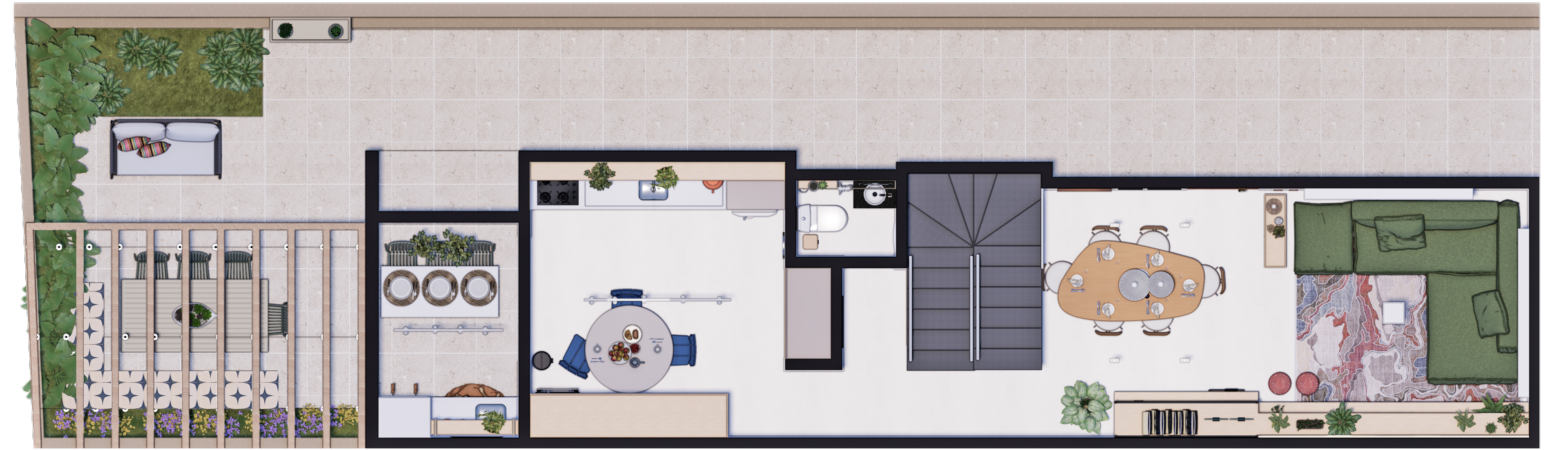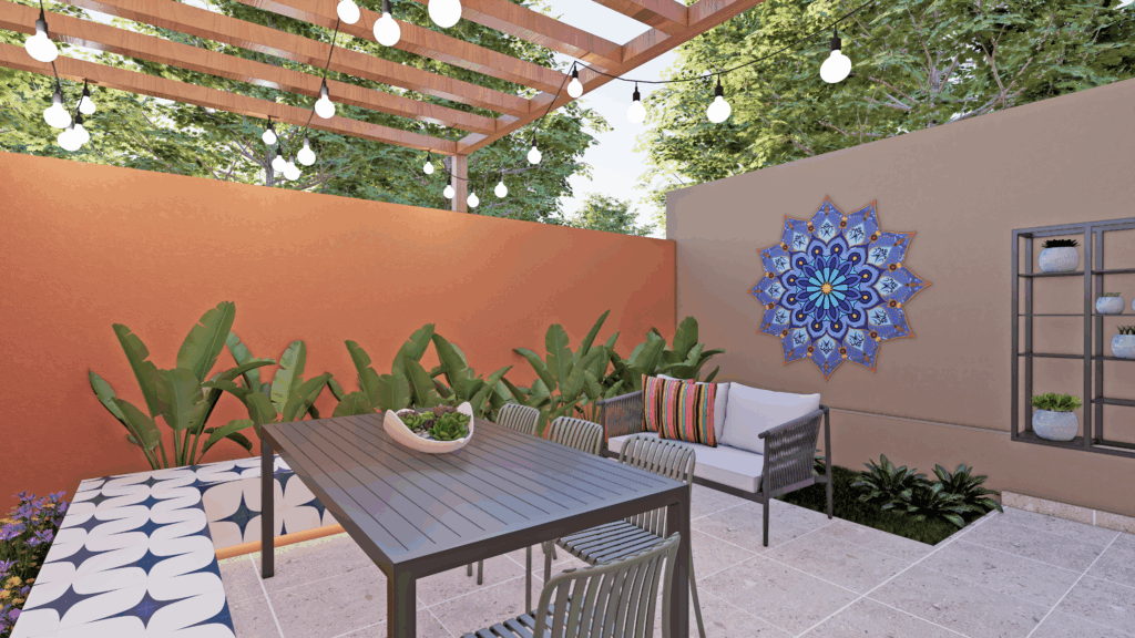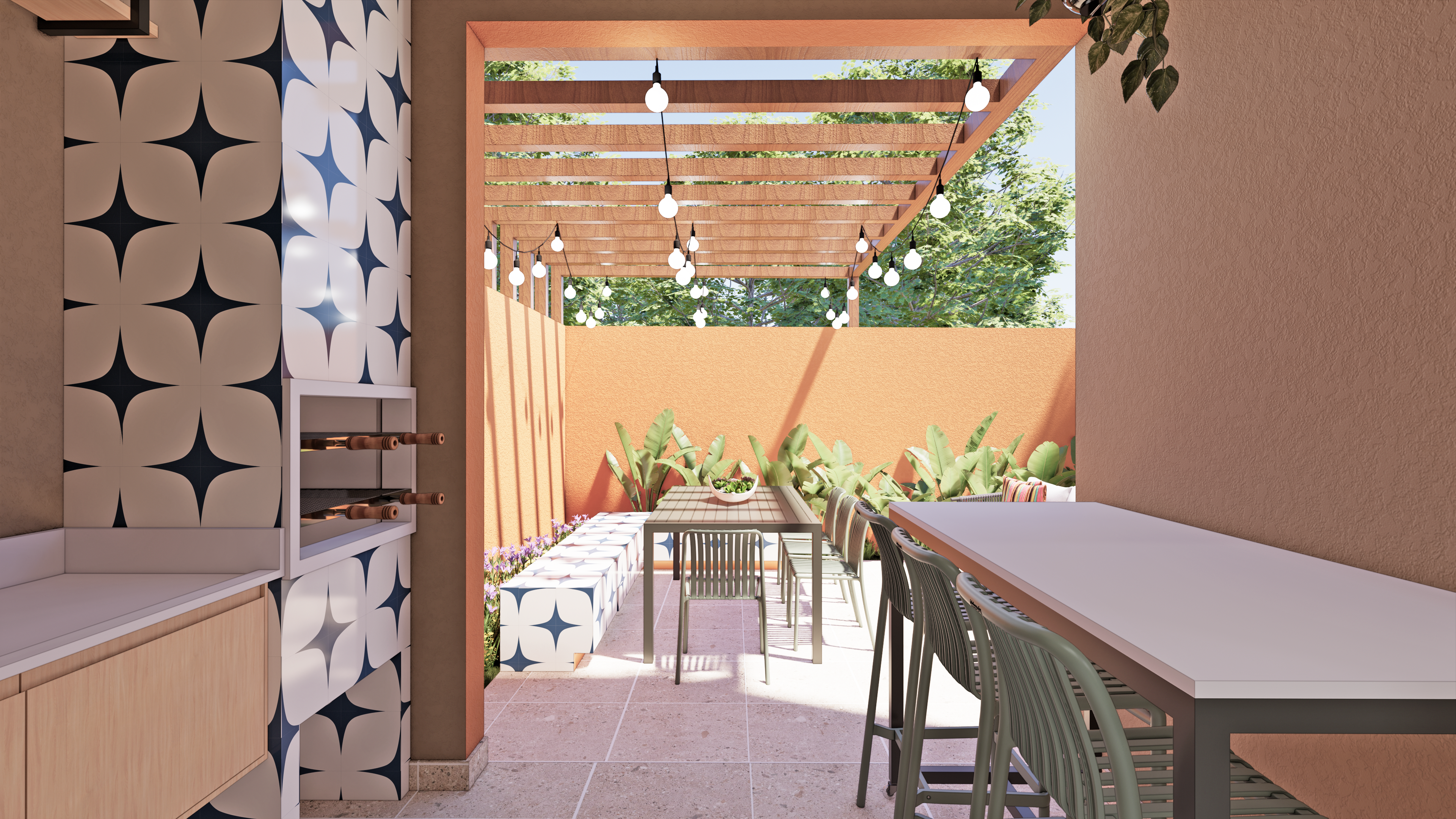 Para integrar a área gourmet ao jardim, foi instalado um pergolado que cria uma conexão fluida entre os dois espaços. Sob o pergolado, uma mesa de jantar com cadeiras oferece um ambiente perfeito para refeições ao ar livre.
