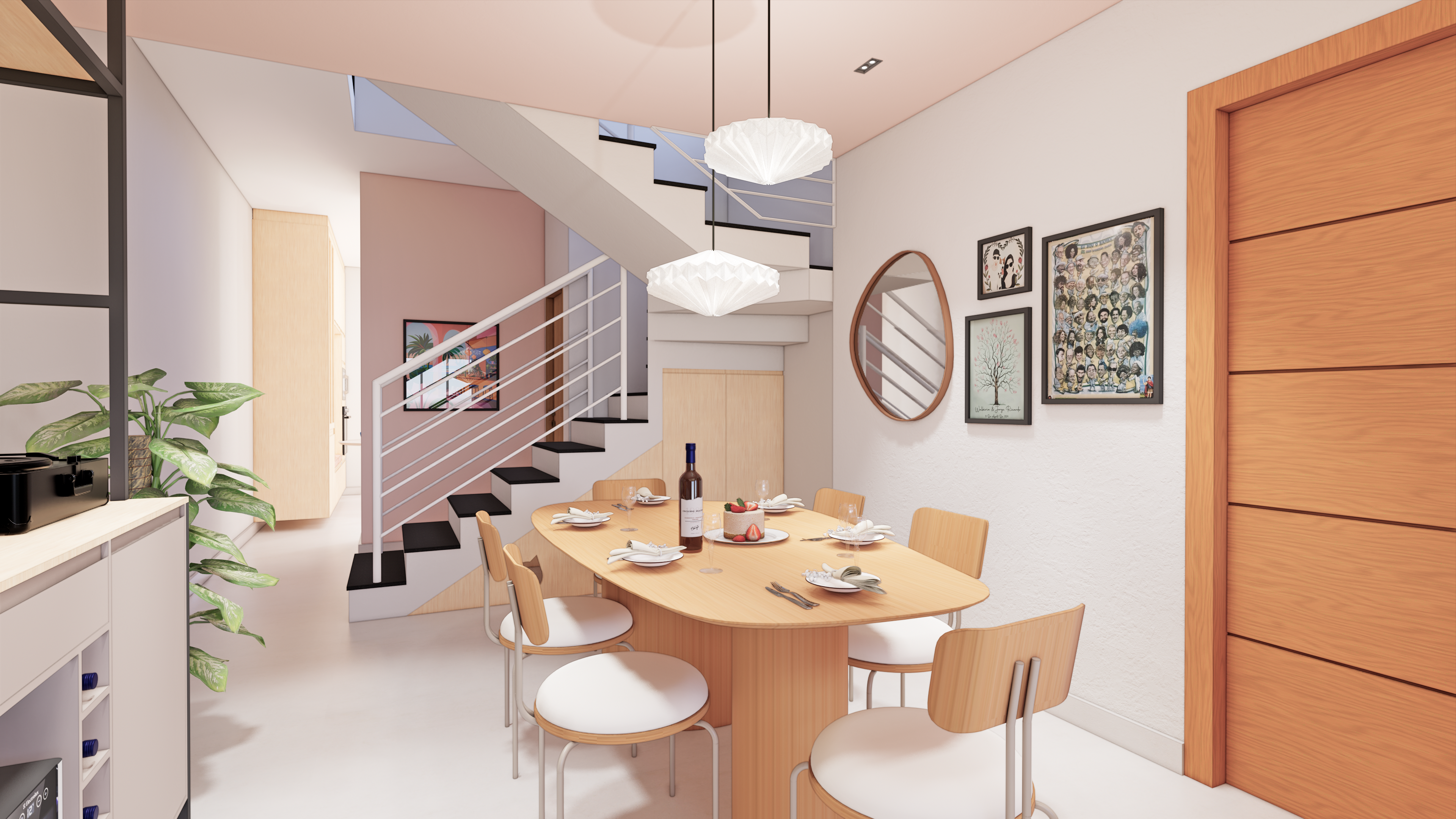 A sala de jantar ainda ganha destaque com uma mesa de jantar de design orgânico e moderno, que combina perfeitamente com os pendentes acima dela.