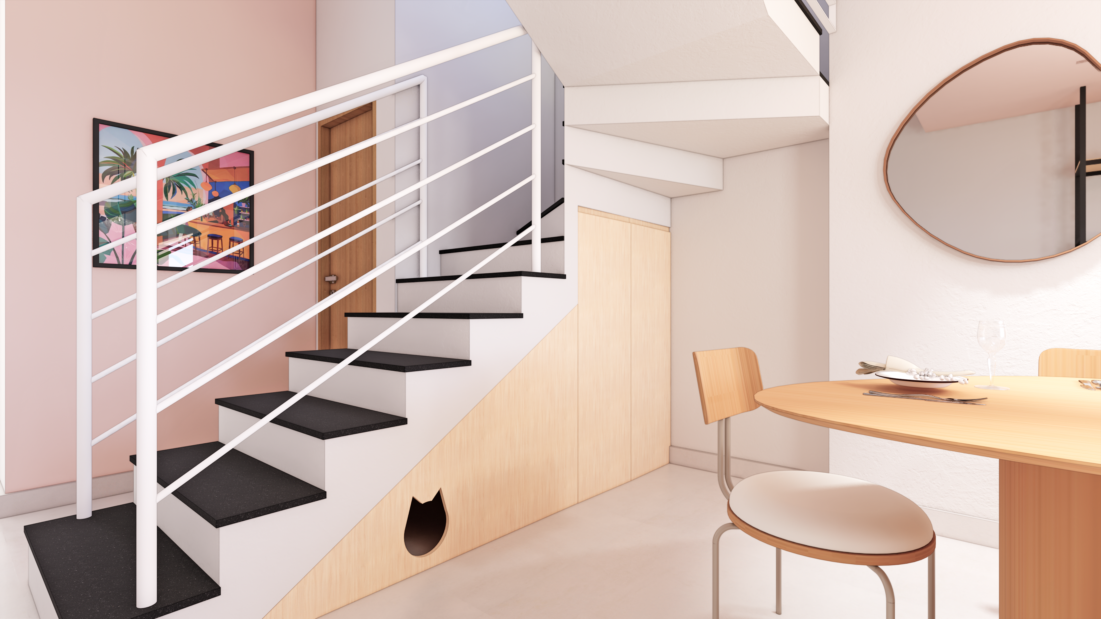 Aproveitando o espaço normalmente inutilizado sob a escada, foi criada uma peça de marcenaria inteligente. Além de oferecer um armazenamento prático, a peça foi projetada especialmente para os gatos do casal, com uma portinha que oculta a caixa de areia. A entrada discreta permite que os gatos utilizem o espaço sem que a caixa fique visível.