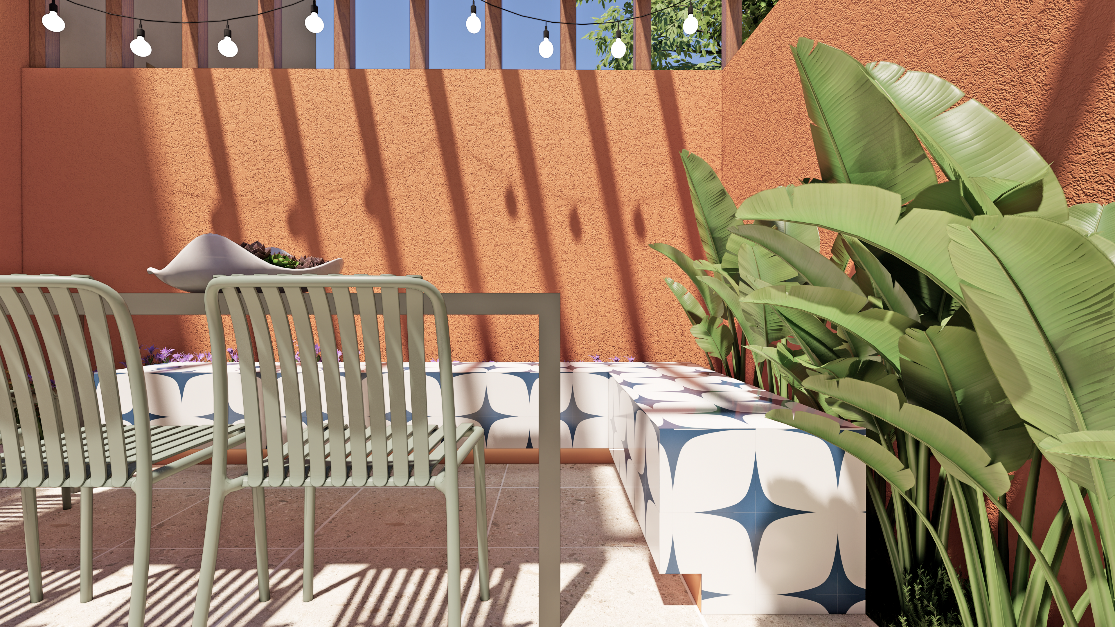 O grande diferencial desse espaço é o banco em L, feito de alvenaria e revestido com o mesmo azulejo da churrasqueira, que acomoda parte dos assentos da mesa.