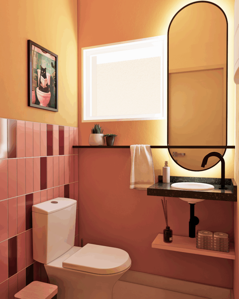 O lavabo foi envolvido por uma pintura de tom amarelo mostarda, que recobre paredes, teto e até mesmo a porta interna. Essa cor quente cria uma harmonia perfeita com o revestimento atrás do vaso, que traz tons suaves de rosa. Para equilibrar o ambiente, o design da área da pia foi mantido leve e funcional, garantindo que, apesar do espaço compacto, o lavabo se mantenha sem sobrecarga visual.