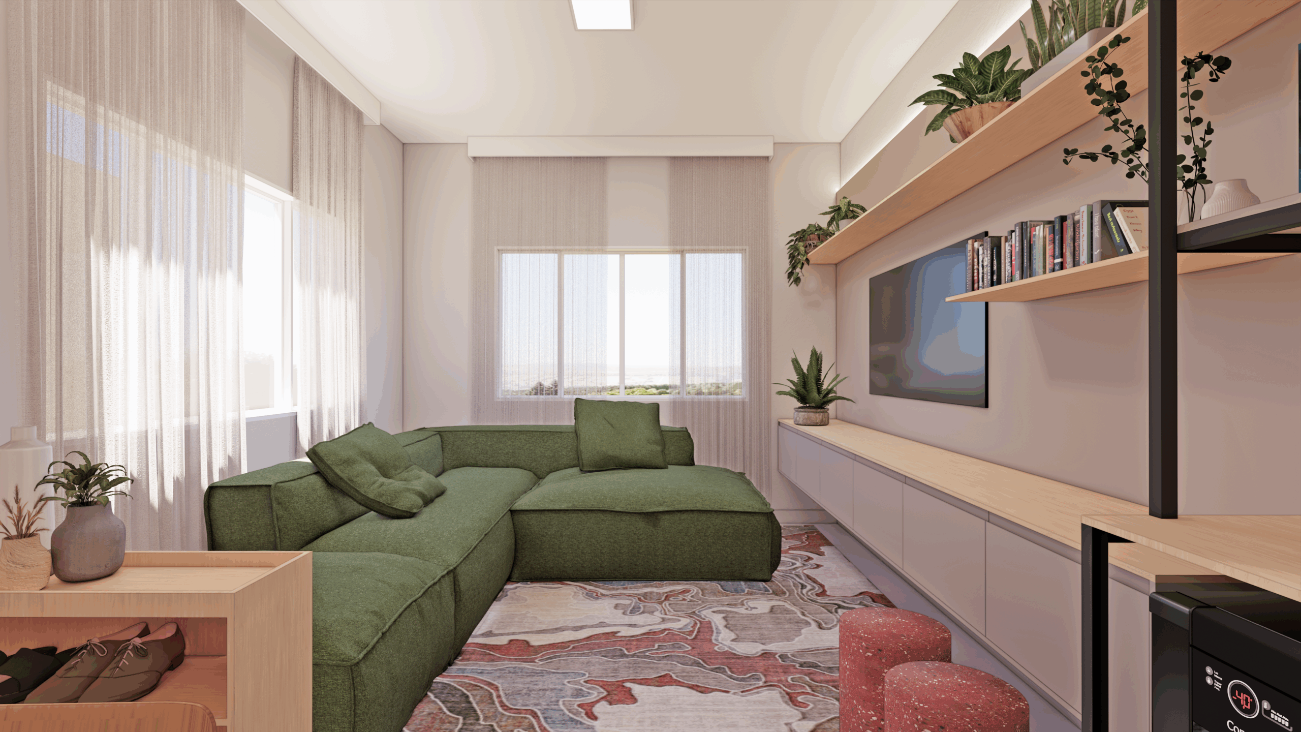 Pensada para ser um ambiente convidativo, a sala de estar conta com um sofá verde super confortável que chama ao relaxamento.