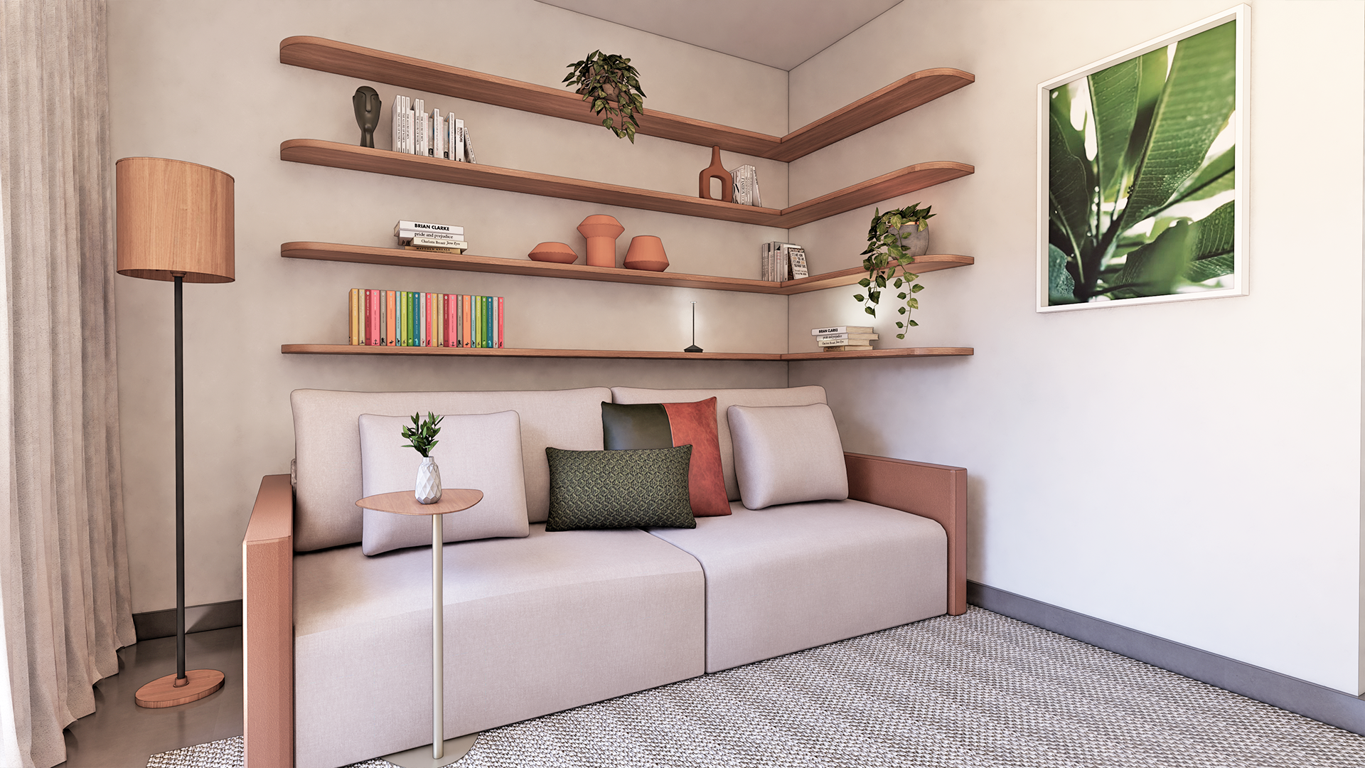 Foi um projeto que teve como foco um ambiente híbrido, o quarto que também precisava ser escritório.